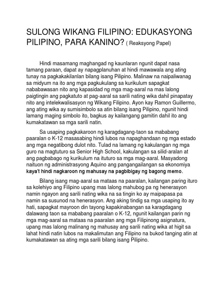 Reaksyong Papel Sulong Wikang Filipino Pdf