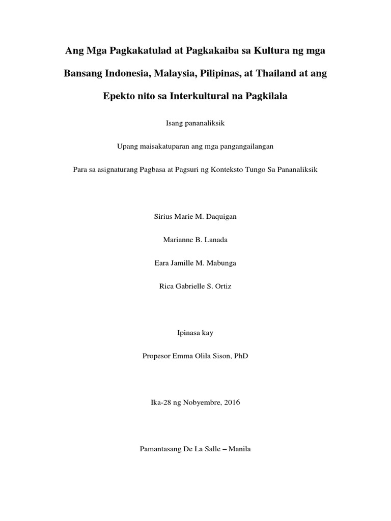 Ang Mga Pagkakatulad at Pagkakaiba sa Kultura ng mga Bansang Indonesia Malaysia Pilipinas at Thailand at ang Epekto nito sa Interkultural na Pagkilala Isang pananaliksik Upang maisakatuparan ang mga pangangailangan Para sa asignaturang Pagbasa at Pagsuri ng Konteksto Tungo Sa Pananaliksik Sirius Marie M.