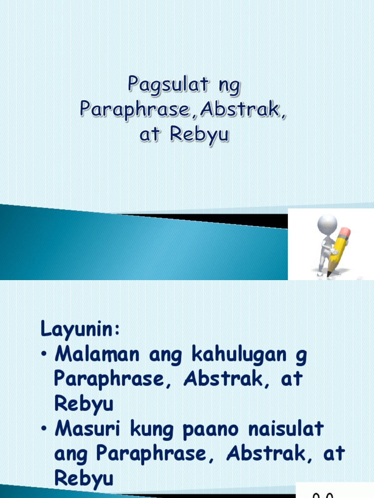 Ito ay bahagi ng pagsusulat na kung saan inilalagay ng pasiksik ang mga. ANO ANG PAGKAKAIB NG ABSTRAK AT REBYU. Pagsulat ng-paraphrase-abstrak-at-rebyu 1.